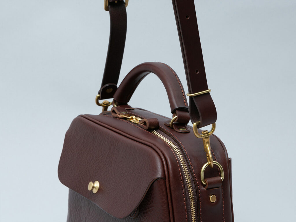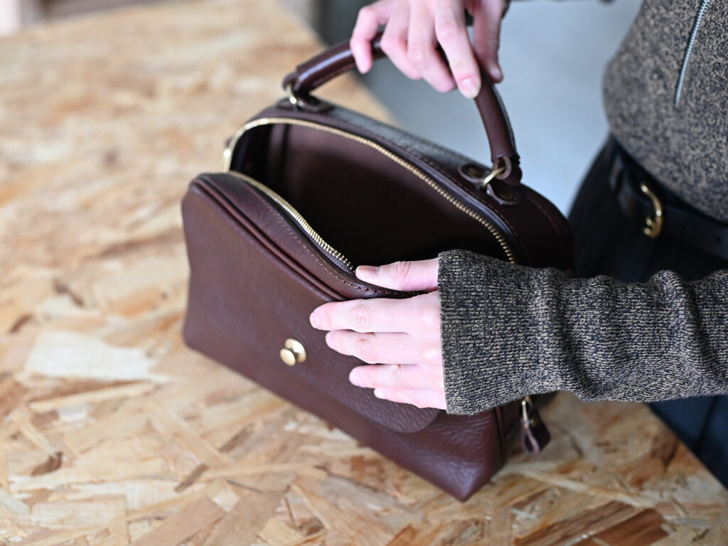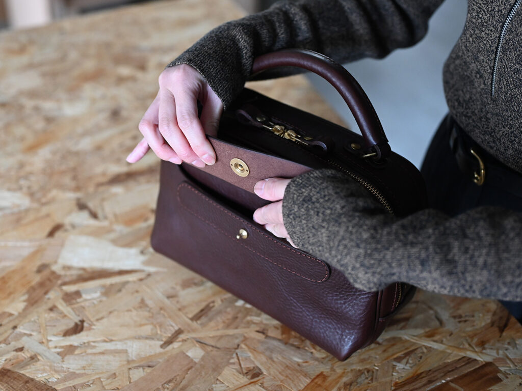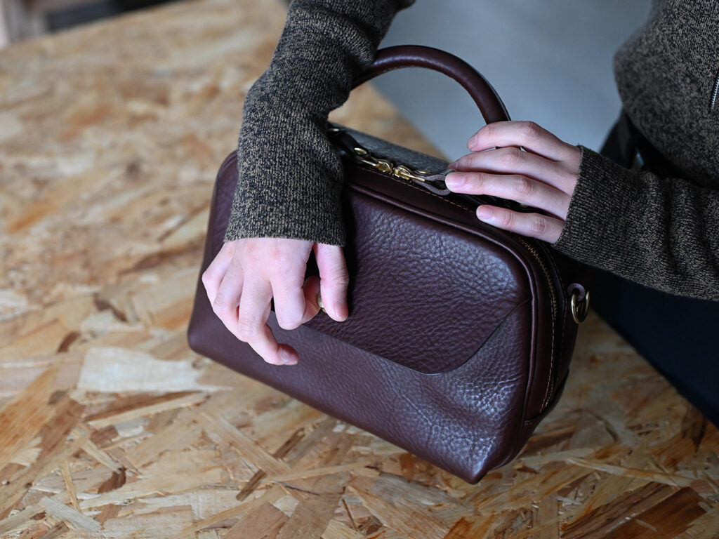 しっかりと作られた一本手のハンドルは手持ちと腕掛けどちらでもお使いいただける長さに設定しています。