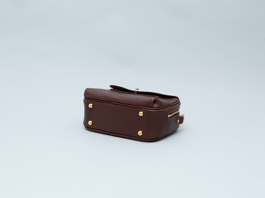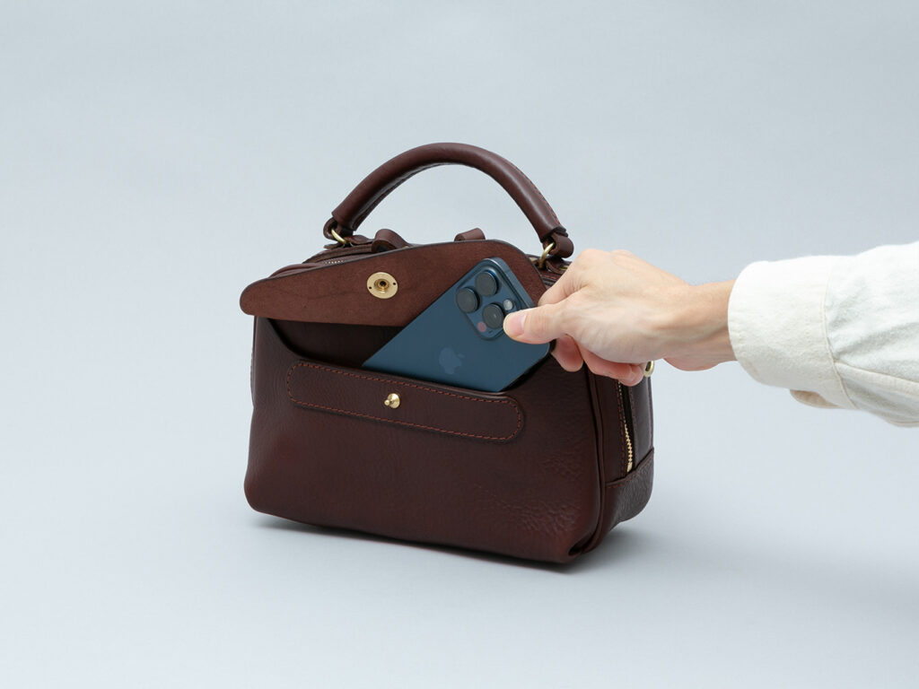 この鞄のポイントにもなっている前面ポケットはドイツホック留めのかぶせを取り付けています。底部分に小さなマチを付けているためキーケースやスマートフォンなどの立体的な小物も収納可能です。