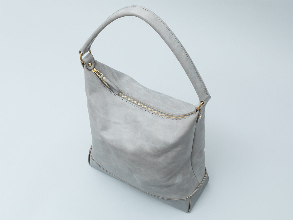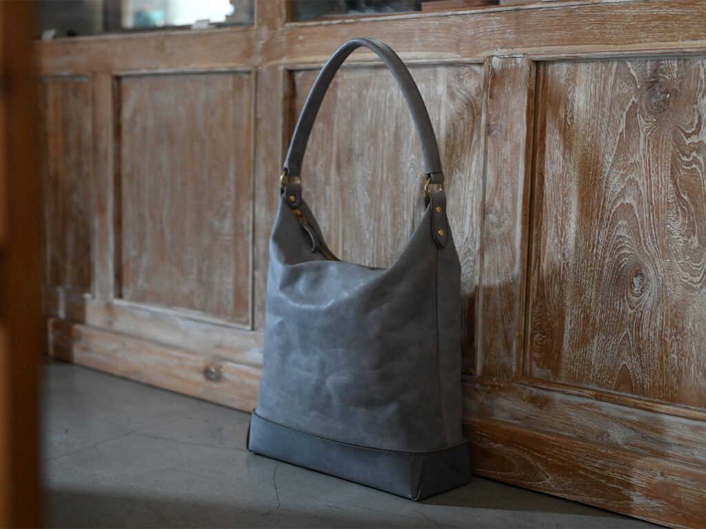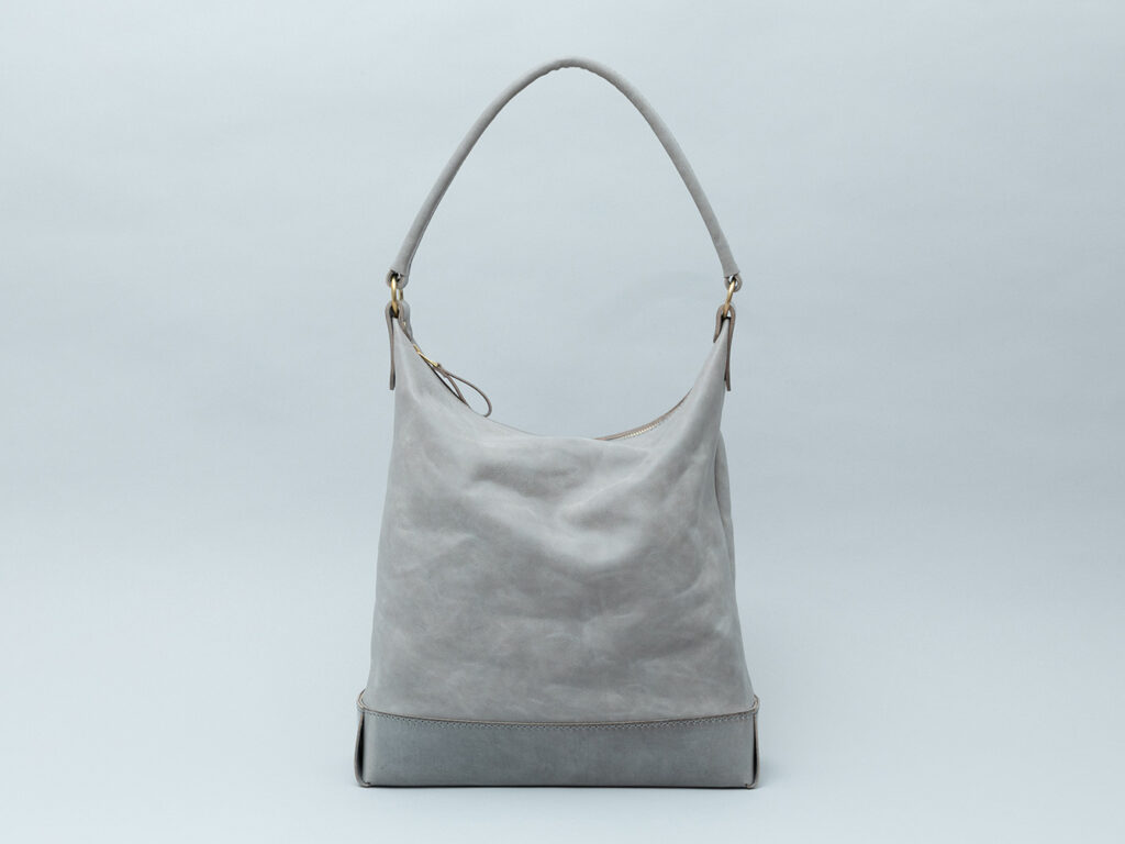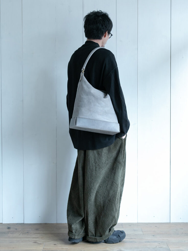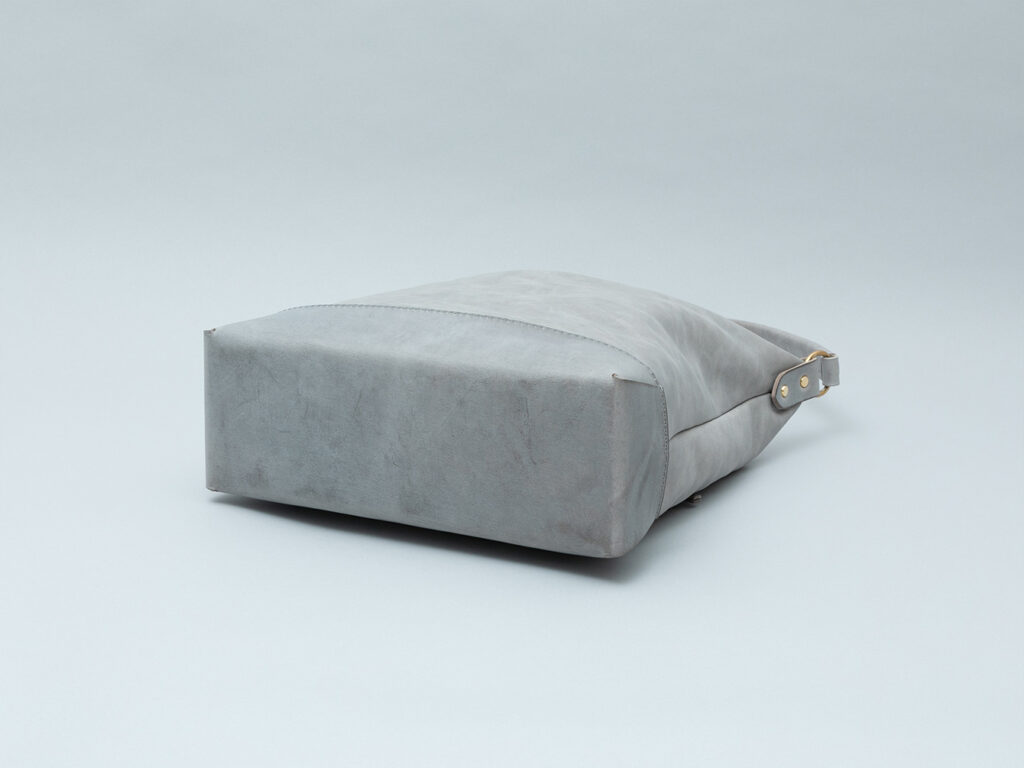 本体の柔らかさと対照的に底部分はシビラリスシオで切り返しをしているため、革質のコントラストを楽しみつつも床に置いた時にしっかりと自立するように仕立てています。底部分のみで見ると一枚ハギで作られているため、すっきりとしたシンプルなバランスを保っています。