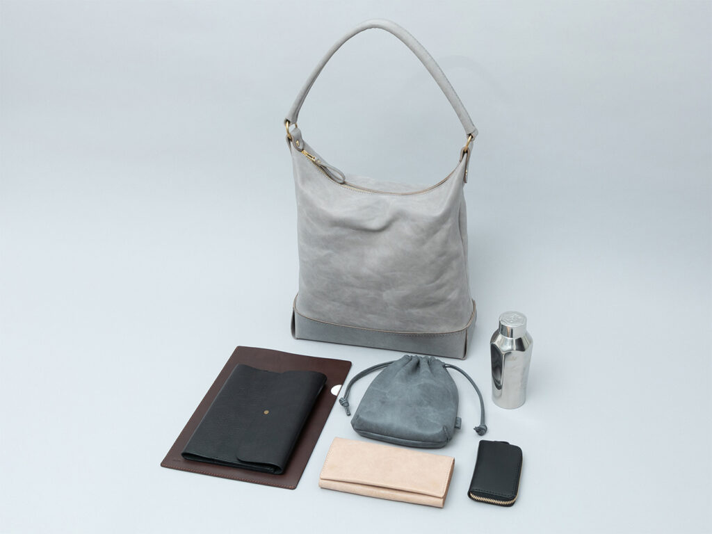 写真ではフラップノートカバーL(NC-2029-L)、A4レザーファイル(NC-1052)、ドローストリングポーチM(PO-3037-M)、スクエアウォレットL(WA-3005-L)、ラウンドジップキーケース(KH-1028)、タンブラーを収納しています。