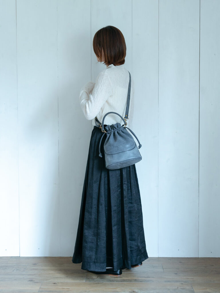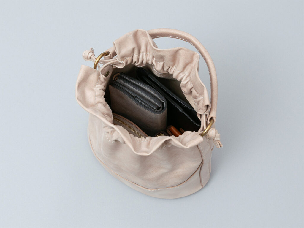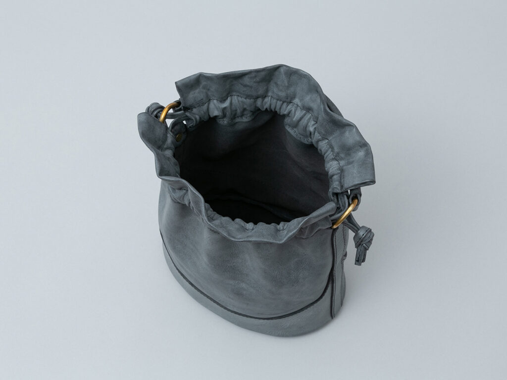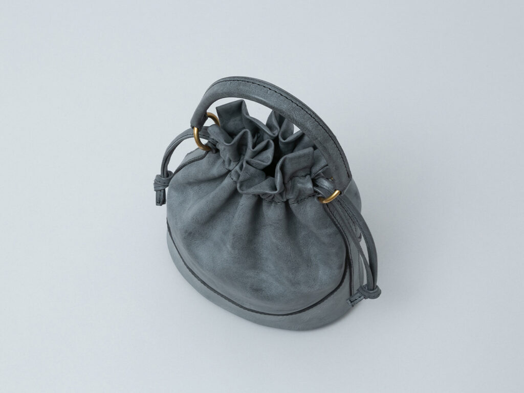 くしゃっとした包み紙のような開閉部。本体部分には柔らかなシビラボックスを使用しており、使いはじめは紐の引き絞りにきつさを感じますが、使い込むことでするっと解けるように開閉できるようになります。