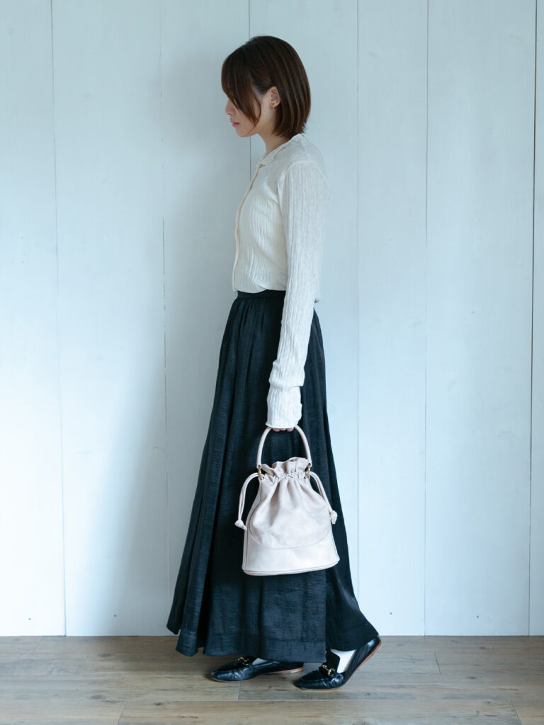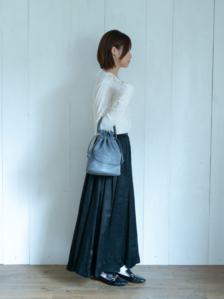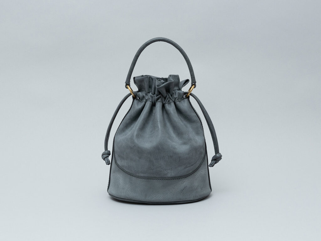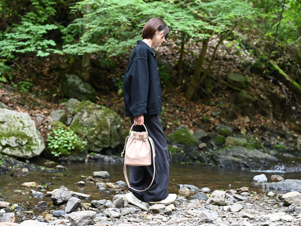 くしゃっとした包み紙のような開閉部。本体部分には柔らかなシビラボックスを使用しており、使いはじめは紐の引き絞りにきつさを感じますが、使い込むことでするっと解けるように開閉できるようになります。