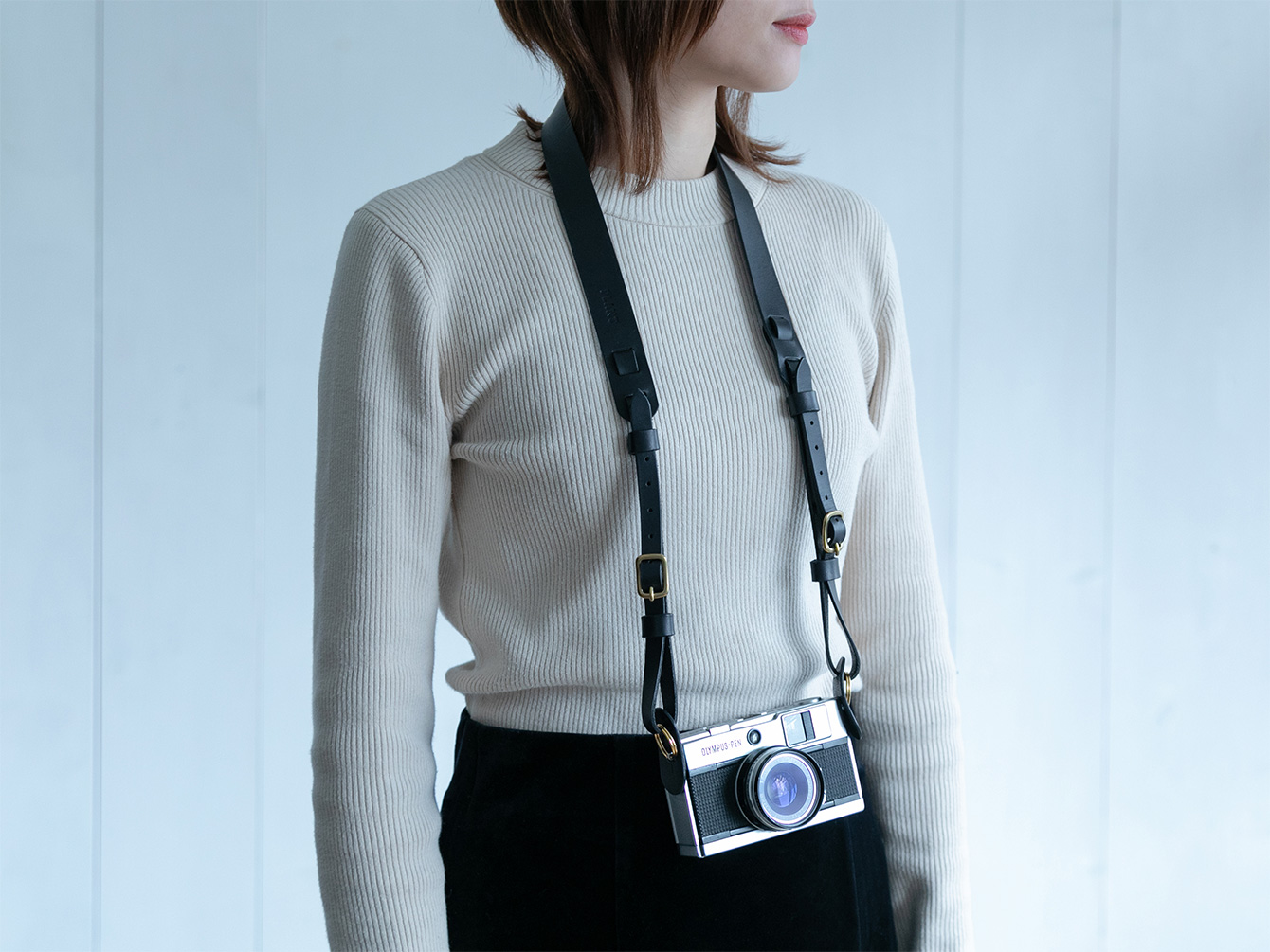 しなやかな革の質感が優しく体にフィットするカメラストラップ。