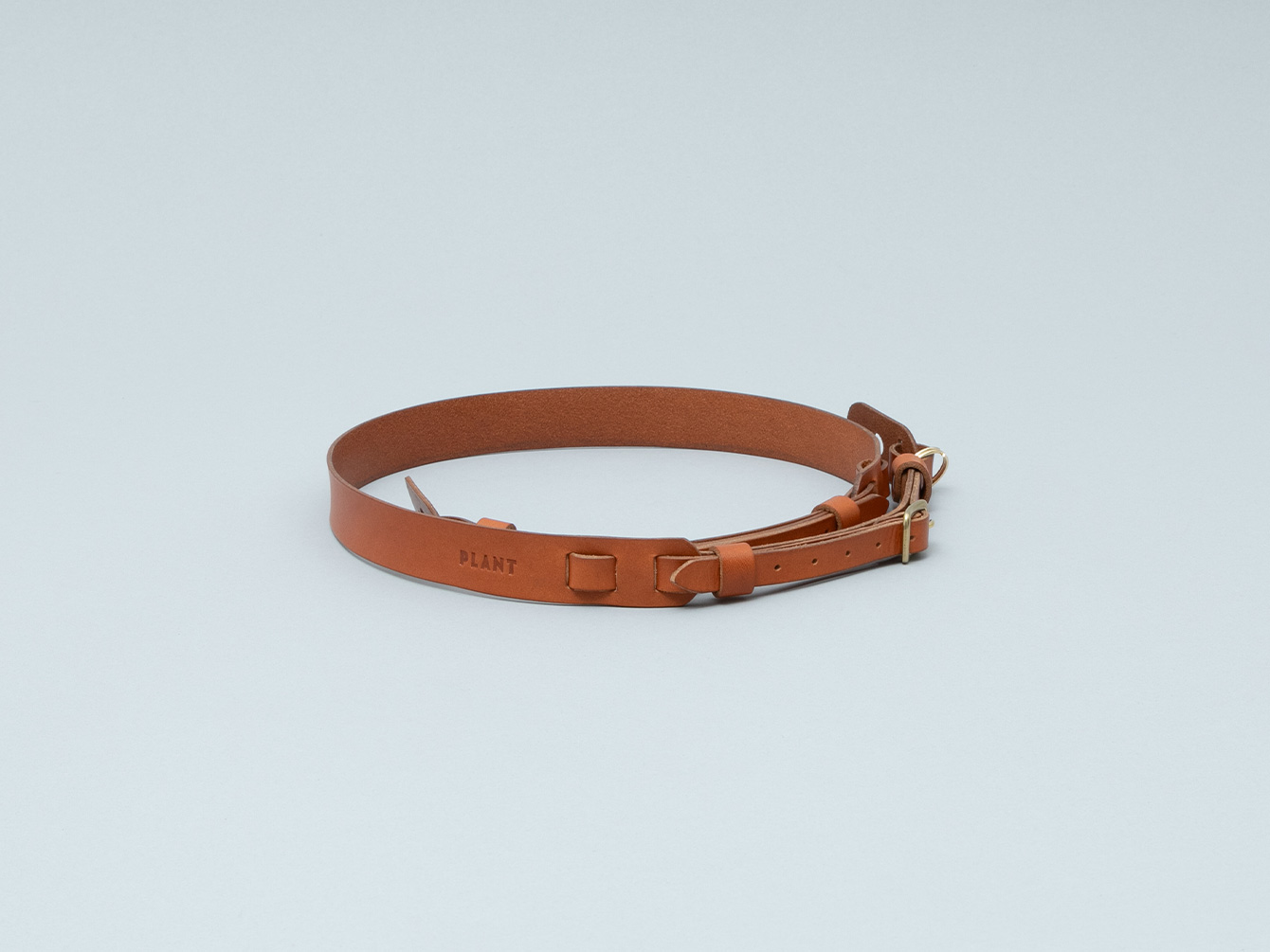 カメラへの取り付け部分は革を折り返すことで端に余りが出ず、根本と先端の2箇所にループ留めをつけることで使用する際にバタつかない作りになっています。両側に付属した調節金具は片側6穴ずつで全長90cm-98cmと細かい長さ調整が可能です。